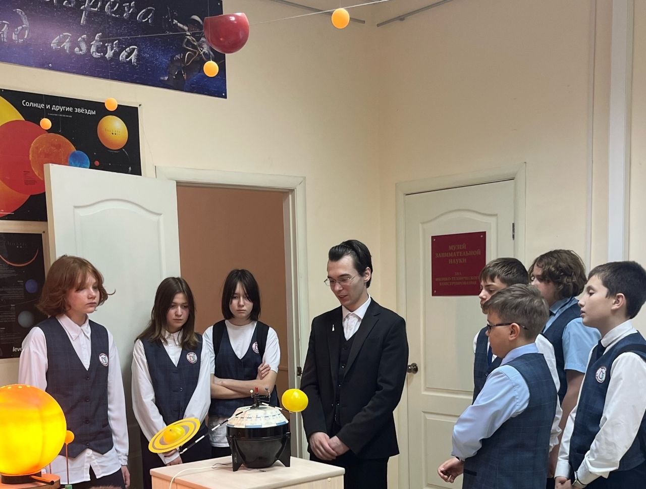 В зале астрономии вместе со студентом профилей «Физика. Технология», председателем студенческого научного кружка «Лаборатория занимательной физики и астрономии» Осиповым Денисом гости изучали интерактивную звёздную карту, электромеханическую модель Солнечной системы, наблюдали реактивное движение «ракеты»...